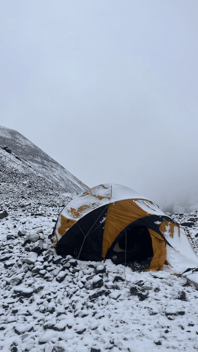 But the mountain had its plans. By morning, the world outside our tent had transformed—thick clouds hung heavy in the air, snow blanketed the ground, and our tent sagged under its weight. With visibility fading and conditions uncertain, we made the difficult decision to turn back, leaving the summit untouched but not our spirits.